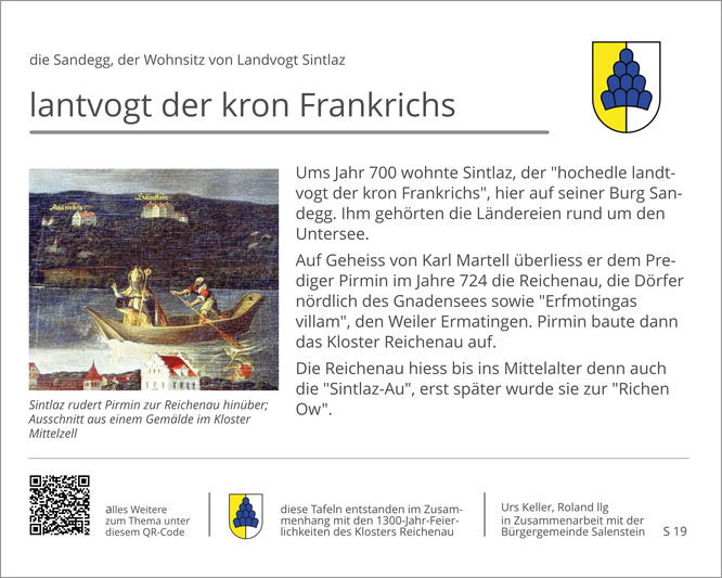 In der Zeit nach 700 bewohnte der fränkische Landvogt Sintlaz die Burg Sandegg; ihm gehörte u.a. auch die heutige Insel Reichenau.